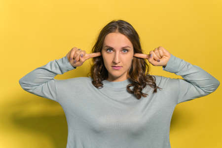 Young woman vexed with noise covering ears with fingers, a girl does not want to listen loud music, no desire to listen to an opponent in an argument, studio shot isolated on yellow