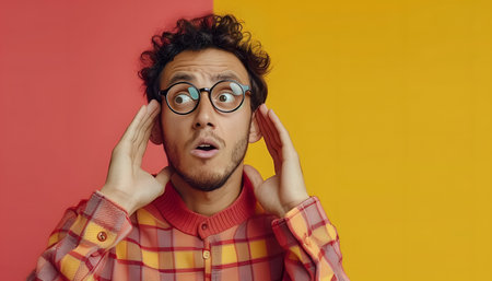 Surprised young man with glasses holding hands near ears against a yellow and red background.