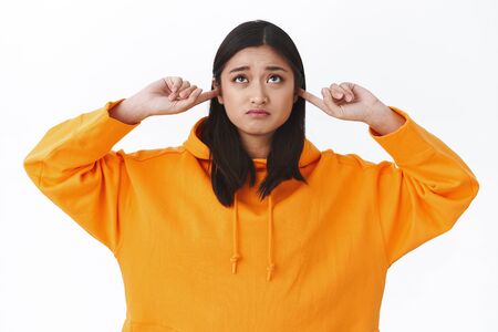 Girl complaining noisy neighbours upstairs, feeling displeased and fed-up, shut ears with fingers frowning and looking up with sad grimace, someone listening loud music, white background