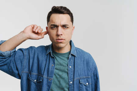 Young brunette man looking at camera and plugging his ears isolated over white background