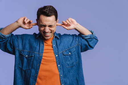 Deaf young man with closed eyes covering ears. Handsome guy cannot hear. Deafness concept