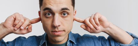 Handsome funny man covering his ears with hands afraid to hear bad news