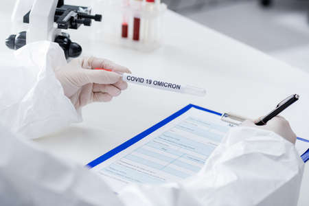 partial view of blurred doctor holding covid-19 omicron variant test tube while writing on clipboard in lab