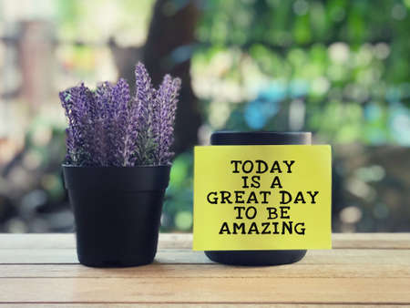 Motivational and inspirational quote - Today Is A Great Day To Be Amazing written on a yellow sticky paper. Blurred styled background.
