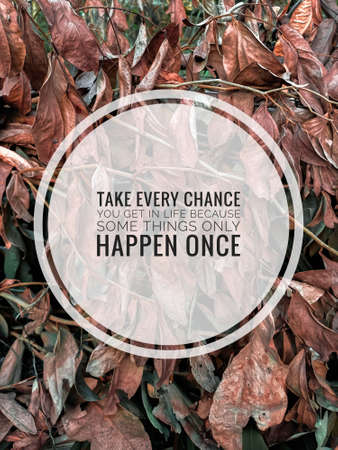 Take every chance you get in life because some things only happen once quote with old leaf background.