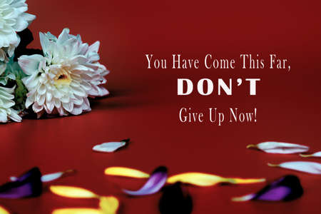 Inspirational and motivational life quote on red background with flowers - You have come this far, don't give up now.