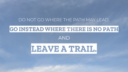 A striking quote, 'DO NOT GO WHERE THE PATH MAY LEAD, GO INSTEAD WHERE THERE IS NO PATH AND LEAVE A TRAIL' is set against a clear blue sky with white, wispy clouds. The words are highlighted in white.