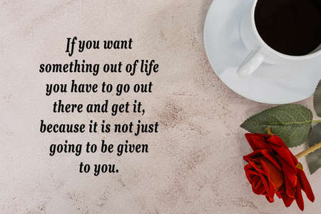Motivational quote with coffee and red rose on marble desk - If you want something out of life you have to go out there and get it, because it is not just going to be given to you.