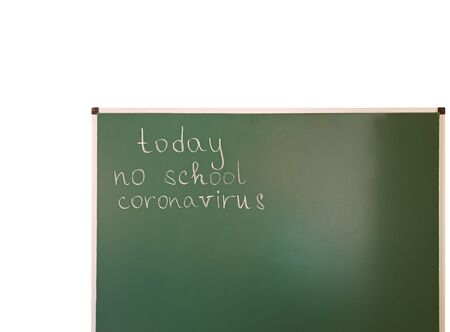 inscription Today no study quarantine written on school blackboard isolated on white. Coronavirus warning sign in classroom. School cancellation due to coronavirus Pandemic