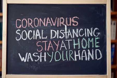 Inscription social distancing stay at home wash your hands. Outbreak Warning. written white chalk on blackboard in connection with epidemic of coronavirus worldwide. Covid 19 pandemic