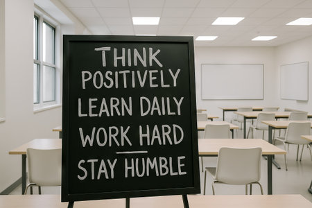 Modern classroom with motivational blackboard for educational inspiration and learning concepts in a bright academic environment.