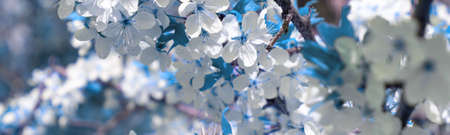 Spring background blue with flower blossom and April floral nature in beautiful scene with blooming tree. Easter Sunny day. Orchard abstract blurred background. Springtime