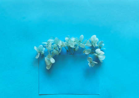Blue envelope with blue flowers hydrangea inside on a blue background