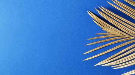 Top view, Golden palm leaves on classic dark blue background. Copy Space Tropical background. Exotic summer trend in minimal style.