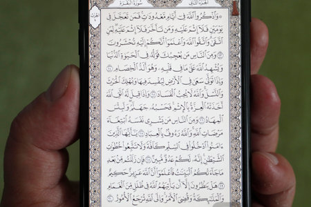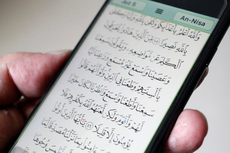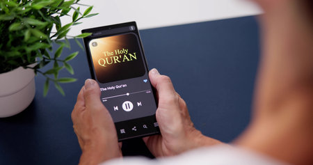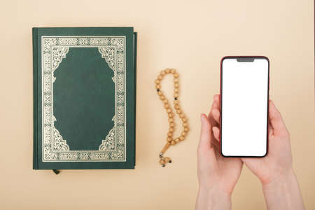 Top view Holly book Koran, rosary, smartphone in hand on a beige background, mockup