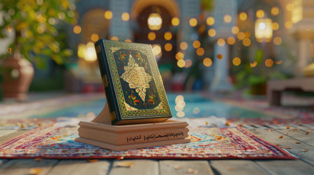 Quran islamic holy book on dark background with with blurred traditional carpet for reading in ramadan night, muslim style and ramadan concept