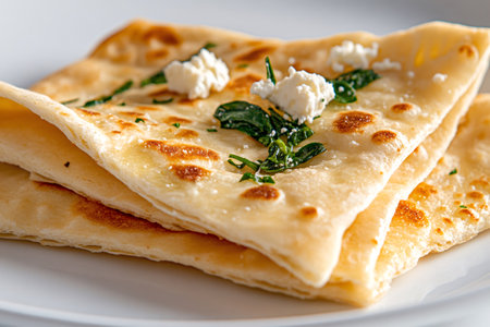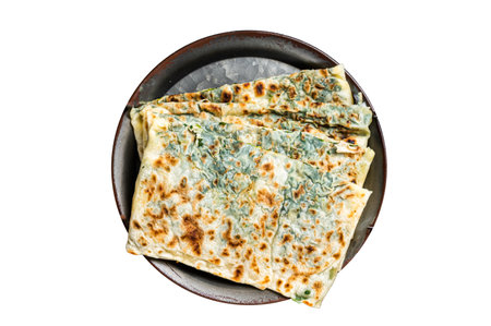 Gozleme Turkish flatbread with greens and cheese. Isolated on white background