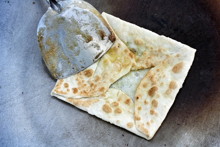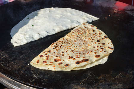 Traditional Turkish dish called gozleme, made of flat bread stuffed with meat or cheese and baked on sheet iron, being prepared for sale at a street food market