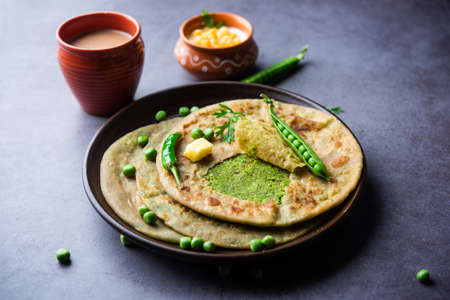 Green Peas paratha or flatbread or matar parathas with curd and hot tea