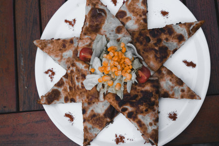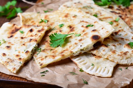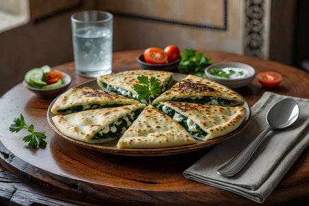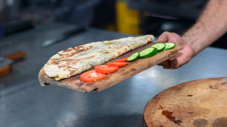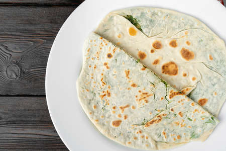 Gozleme. A traditional dish of Turkish cuisine in the form of flatbread stuffed with greens and cheese, wrapped inside. Baked in a pan called a saj. Selective focus, Copy space