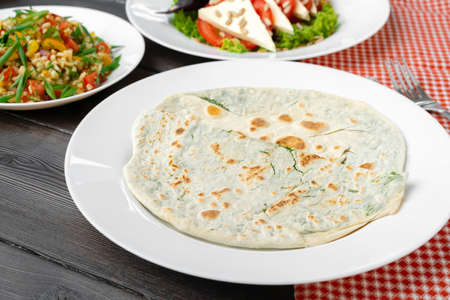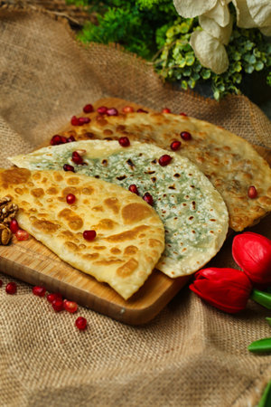 Traditional azerbaijani cuisine flat bread with herbs and meat. Azerbaijan national cuisine kutab or qutab