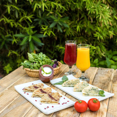 Tasty qutab, Azerbaijani meal with yogurt, juice on the wooden plate