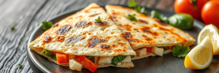 Deliciously toasted quesadillas filled with fresh vegetables served on a rustic plate