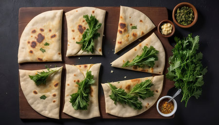 A mouthwatering scene featuring freshly baked flatbread, surrounded by an array of spices and condiments, all set on a rustic wooden table.