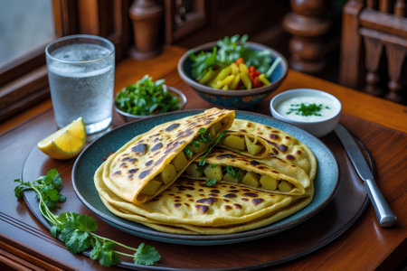 Aloo Paratha / Indian Potato stuffed Flatbread. Served with fresh curd and tomato ketchup. selective focus