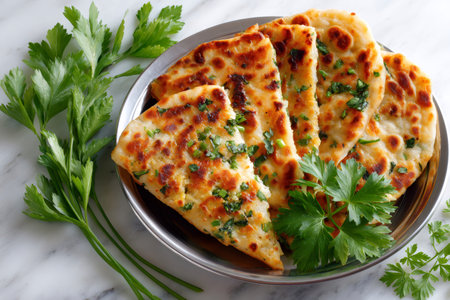 Naan bread slices topping a metal plate, showcasing green parsley and garlic