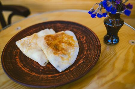 Pancakes to Maslenitsa celebration on the background of wooden boards. Pancakes on a brown plate in a cafe