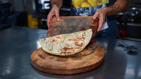 A cooked hot tortilla is cut into pieces and put down on a wooden plate by the chef in the restaurant kitchen.