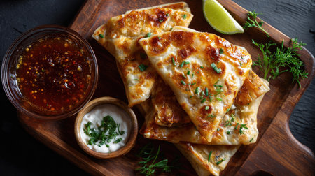 Experience the allure of this delicious golden brown layered flatbread, served warm with creamy yogurt and spicy sauce, perfect for any meal.