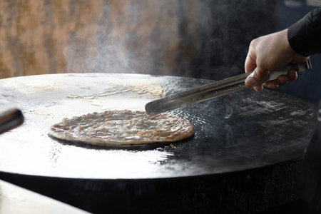 Person bakes traditional Turkish gozleme, specifically Turkish cake, street food