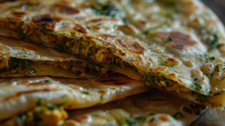 Close-up of a paratha bread stuffed with spicy paneer filling, showcasing the savory filling oozing out of the flaky layers, tempting viewers with its deliciousness.