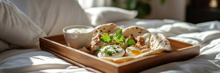 A warm breakfast scene with pita, chicken, boiled egg, yogurt dressing, and mint tea on a dark tray, placed on a white linen bed, illuminated by soft, early morning sunlight, banner