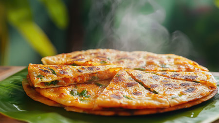 This mouthwatering image showcases a golden, crispy vegetarian flatbread garnished with fresh herbs. The steam rises, enhancing the appetizing aura. Perfect for any gathering, this dish highlights vibrant colors and textures, promising a delightful culinary experience.