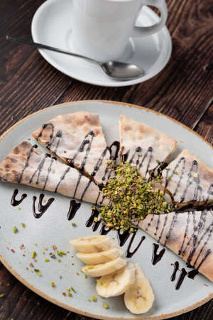 Banana, Chocolate and Pistachio quesadilla with coffee.