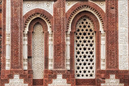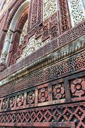 The ancient temple complex of Qutub Minar. details. The facade is made of red sandstone and white marble decorated with carved ornaments. The arched windows