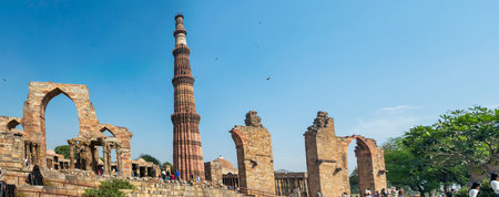 New Delhi, India - January 5, 2020: Tourists enjoy Qutub Minar complex and ruins