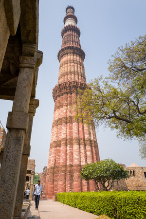 Delhi, India - March 30, 2024: The image shows the Qutub Minar rising behind a stone colonnade, with a visitor walking along a pathway bordered by green hedges and a tree at the Qutub Minar archaeological complex under a clear sky.