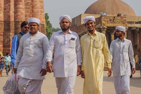 Delhi, India - October 28, 2017: Four Muslim men on the territory of Qutub Minar