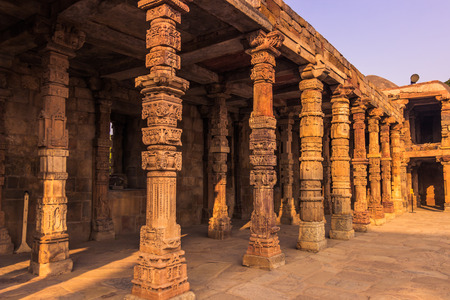 Columns with stone carving in courtyard of Quwwat-Ul-Islam mosque, Qutub Minar complex. It is UNESCO world heritage site at New Delhi,India