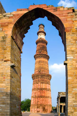 DELHI, INDIA - SEPTEMBER 25 2017: Beautiful view of Qutub Minar, through of a stoned arch built in the early 13th century located on south of Delhi, India