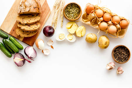 Set of products for cooking - apple, bell pepper, cucumber, fresh bread, eggs, sliced ham, broccoli, cheese, avocado and cleaver on white vintage wooden work surface warm filtered