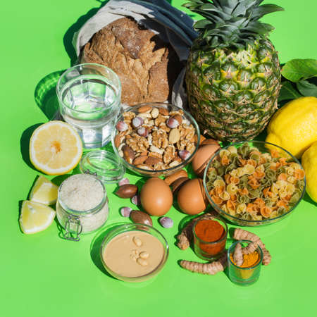 Balanced nutrition concept for low purine eating and diet to stop gout. Assortment of healthy food ingredients for cooking on a kitchen table
