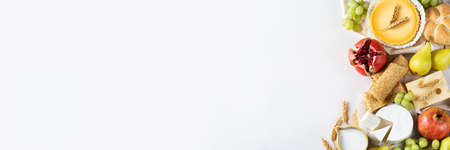 Jewish religious holiday Shavuot with dairy products, cheesecake, pancakes, fruits