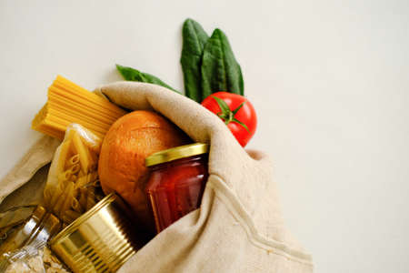 Food supplies crisis food stock for quarantine isolation period on white background. Food delivery, Donation, coronavirus quarantine. Copyspace.