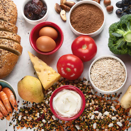 Natural sources of chromium. Natural healthy products containing chromium:egg, tomato,cocoa, grape, bread, bean, shrimp, potato, yogurt. Top view