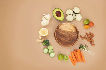 healthy fruits vegetables dryfruits bread seeds cheese egg oil with empty plate white background